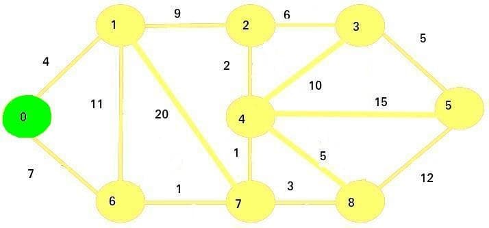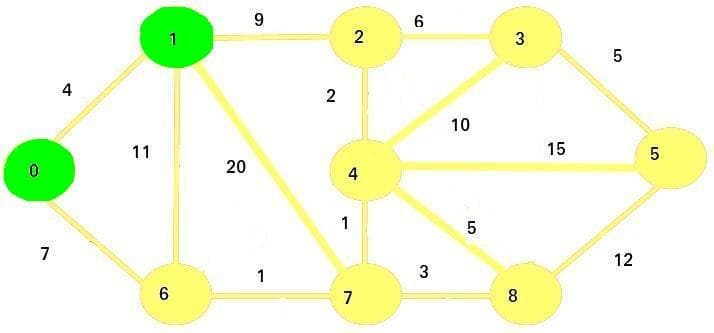 We pick the vertex with a minimum cost - that vertex is 0. We will mark it as visited and add it to our set of visited vertices. The visited nodes will be marked with green color in the images: