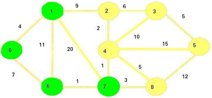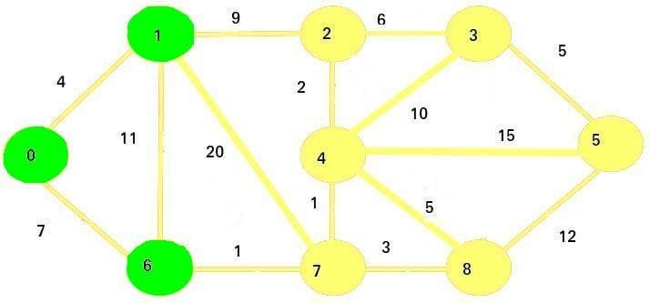 We mark it as visited, and then update the adjacent vertices: 2, 6, and 7: