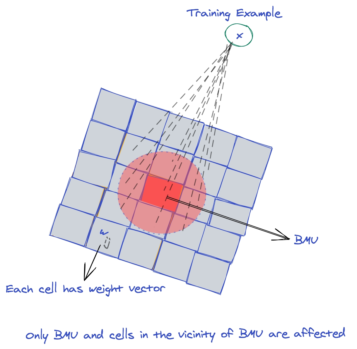 A training example xx effects various cells of the SOM grid by pulling the weights of these cells towards it. The maximum change occurs in the BMU and the influence of xx diminishes as we move away from the BMU in the SOM grid. For a cell with coordinates (i,j)(i,j), its weight wijwij is updated at epoch t+1t+1 as: