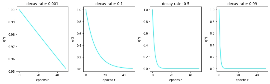 ηη is kept high at the start and decayed as the epochs proceed. One strategy for reducing the learning rate during the training phase is to use exponential decay: