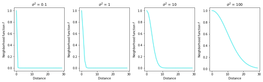 Here β<0β<0 is the decay rate. The decay rate corresponding to radius has the same effect on the radius as the decay rate corresponding to the learning rate. To gain a deeper insight into the behavior of the neighborhood function, let's plot it against the distance for different values of the radius. A point to note in these graphs is that the distance function approaches a near-zero value as the distance exceeds 10 for σ2≤10σ2≤10.