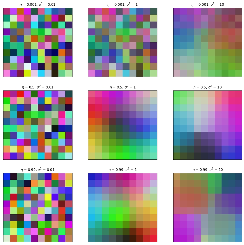 To see how the learning rate varies for different learning rates and radii, we can run the SOM for 10 epochs when starting from the same initial grid. The code below trains the SOM for three different values of the learning rate and three different radii.