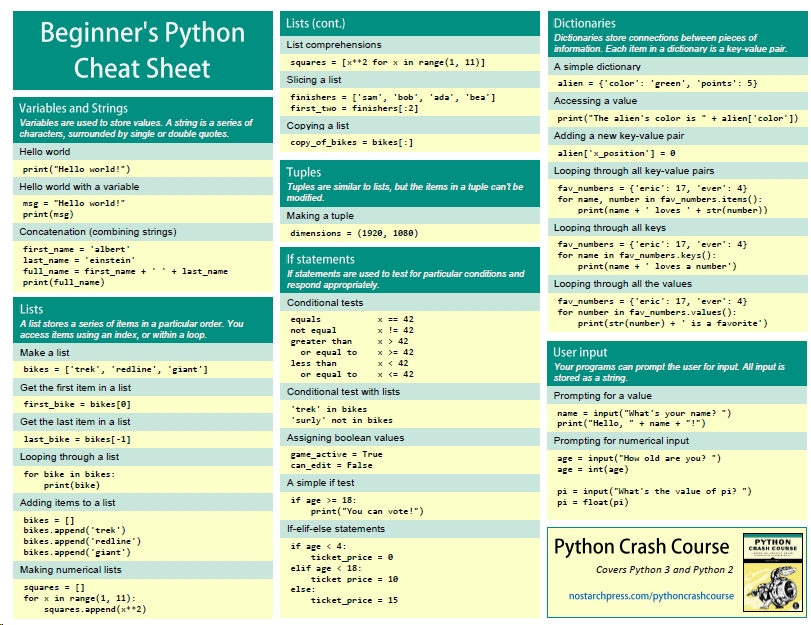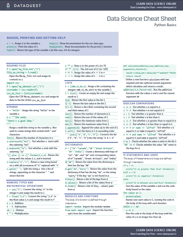 The wonderful team at Dataquest have put together this comprehensive beginners cheat sheet. It covers all the basic data types, looping and reading files. It’s beautifully designed and is the first of a series.