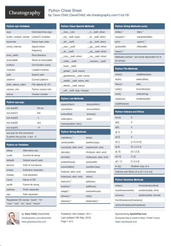 This cheat sheet is for more advanced learners. It covers class, string and list methods as well as system calls from the sys module. Once you’re comfortable defining basic classes and command line interfaces (CLIs), get this cheat sheet. It will take you to another level.