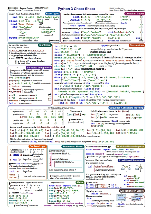 This is the best single cheat sheet. It uses every inch of the page to deliver value and covers everything you need to know to go from beginner to intermediate. Topics covered include container types, conversions, modules, maths, conditionals and formatting to name a few. A highly recommended 2-page sheet!