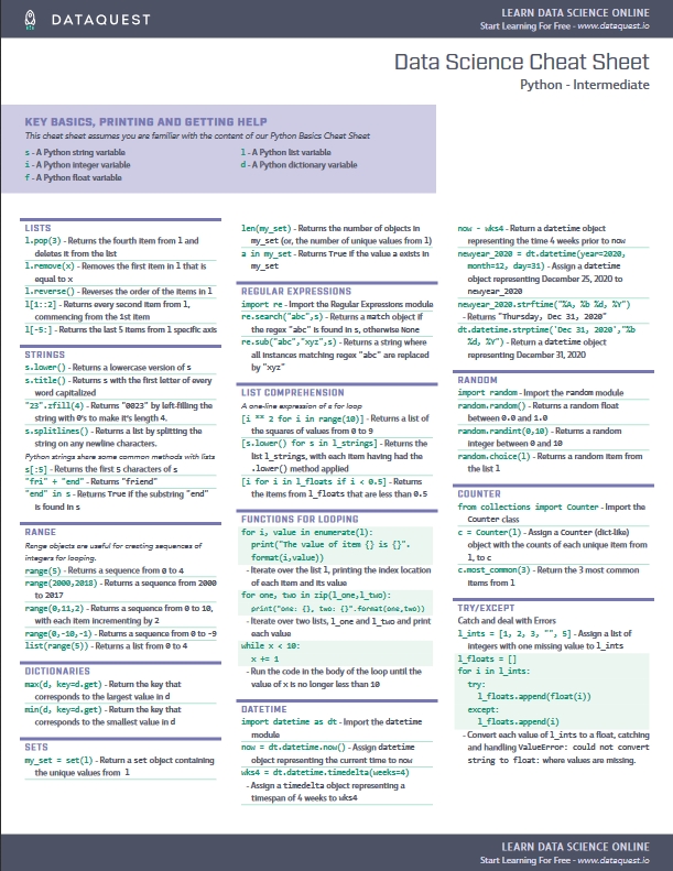 This intermediate-level cheat sheet is a follow-up of the other Dataquest cheat sheet. It contains intermediate dtype methods, looping and handling errors.
