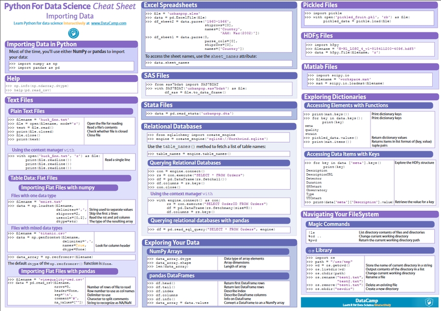 This Python data science cheat sheet from DataCamp is all about getting data into your code. Think about it: importing data is one of the most important tasks when working with data. Increasing your skills in this area will make you a better data scientist—and a better coder overall!