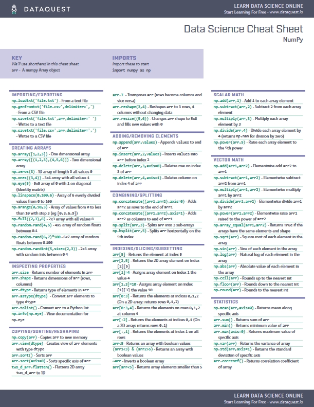 This is only one great NumPy cheat sheet—if you want to get more, check out our article on the 10 best NumPy cheat sheets!