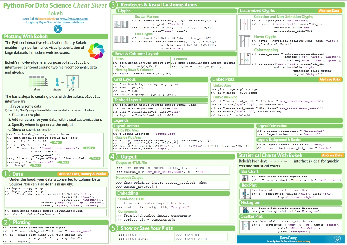 Want to master the visualization library Bokeh? This cheat sheet is for you! It contains all the basic Bokeh commands to get your beautiful visualizations going fast!