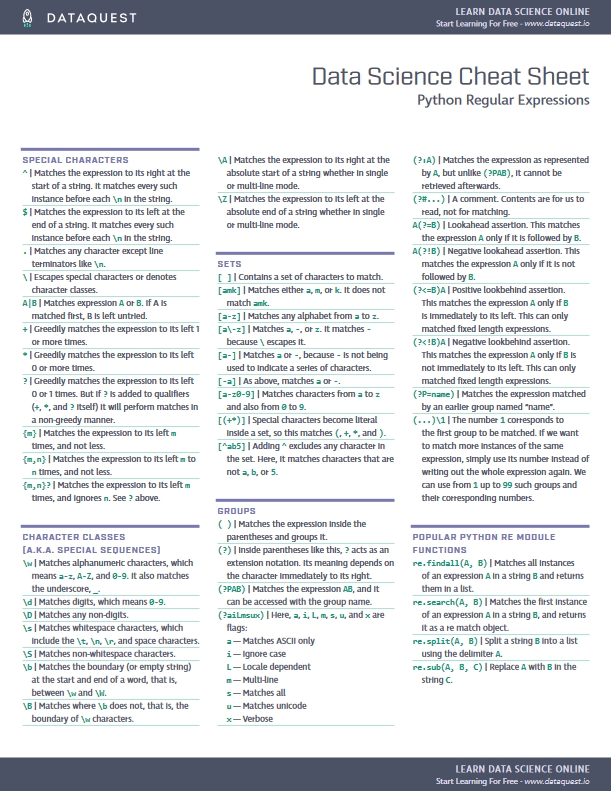 Regex to the rescue! Regular expressions are wildly important for anyone who handles large amounts of text programmatically (ask Google). This cheat sheet introduces the most important Regex commands for quick reference. Download & master these regular expressions!